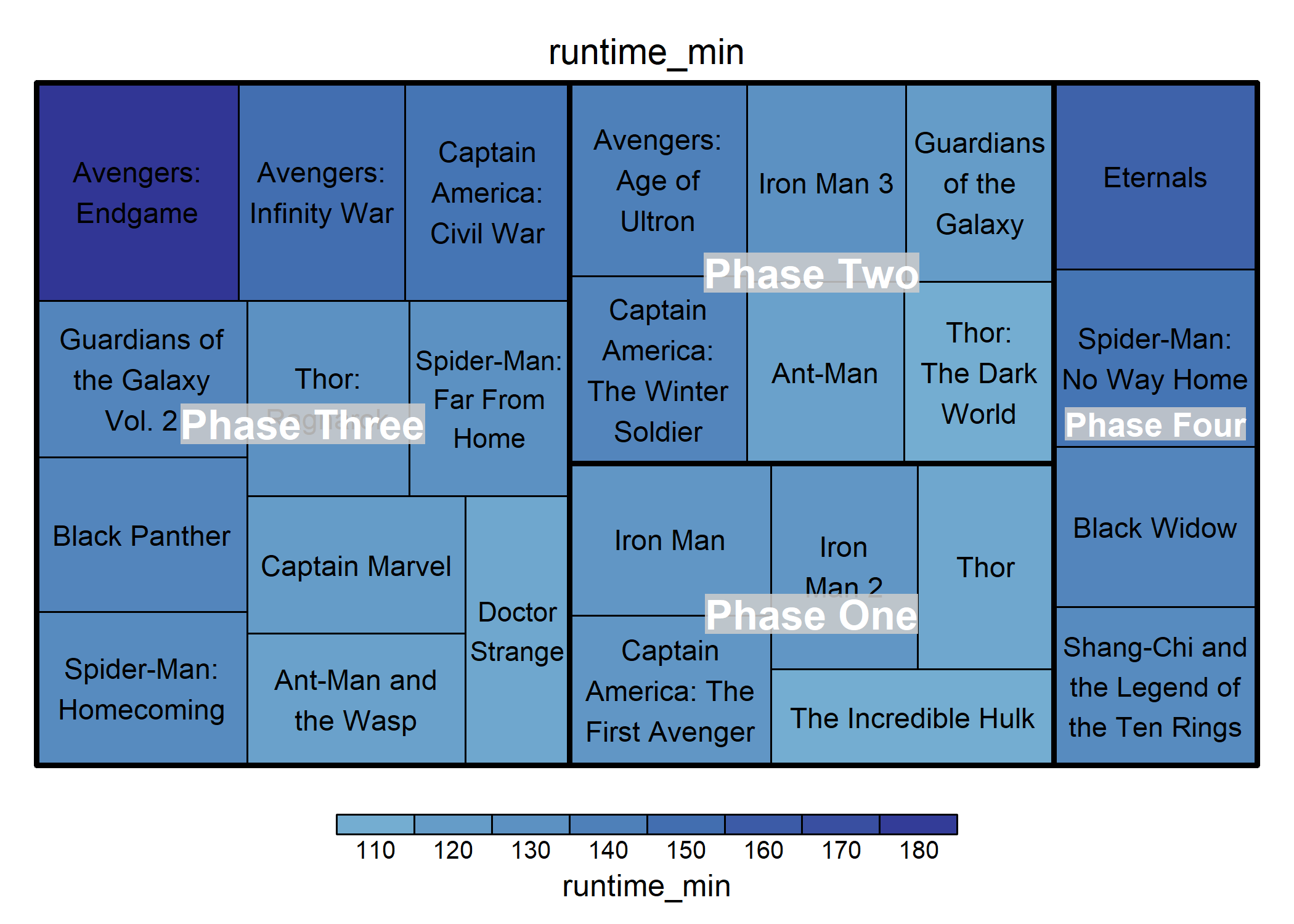Como podemos observar, *Avengers: Endgame* es la más larga y pertenece a la fase 3.